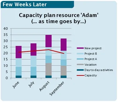 And now, a few weeks later, let’s view the same situation again. As time goes by I assume that efforts in “Project A” rise by 25% and “Project B” cannot be finished in time (should have been completed in July). Now we are looking at an over-allocation of ~50%.