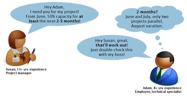 The project manager asks for at least 2–3 months and the resource tempts to confirm this (there are many reasons for this). On the communication level: Adam receives the question with “2 months” (sender-receiver issue). And since this would work out, he simply confirms.